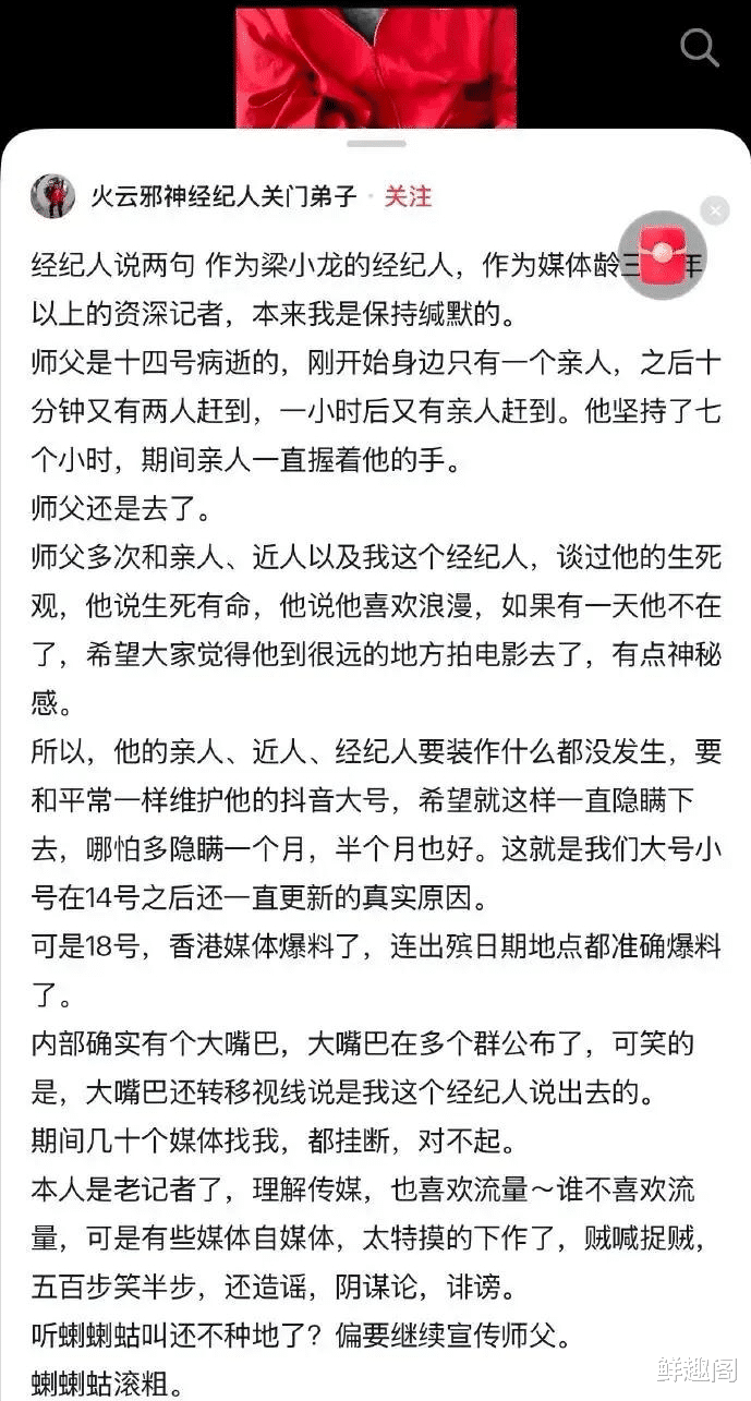 对于这件事情,我们还听到了一些不和谐的声音,2026年1月19日,梁小龙的关门弟子和经纪人发布长文,讲述了事情的内幕情况。文章的大致内容是,梁小龙生前曾告诉过家人和近人,如果有一天他不在了,希望大家觉得他到很远的地方拍电影去了,有点神秘感。